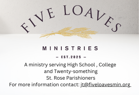 I am happy to announce that we have engaged a new ministry here at St. Rose of Lima and on Long Island. This partnership will be focused on building up and supporting the engagement of the youth and young adult populations of our parish. Please welcome JT Parker, founder and executive director of Five Loaves Ministries to our parish. For more information, see https:// fiveloavesministries.org.
