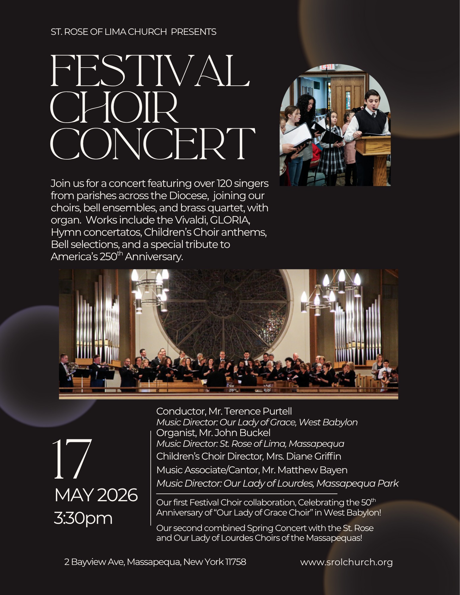 Join us on Sunday, May 17th, at 3:30pm in church, for a concert featuring over 120 singers from parishes across the diocese, together with our choirs, bell ensembles, and brass quartet with organ. Included in the program will be a special tribute to America’s 250th Anniversary. Please see the flyer for complete details.