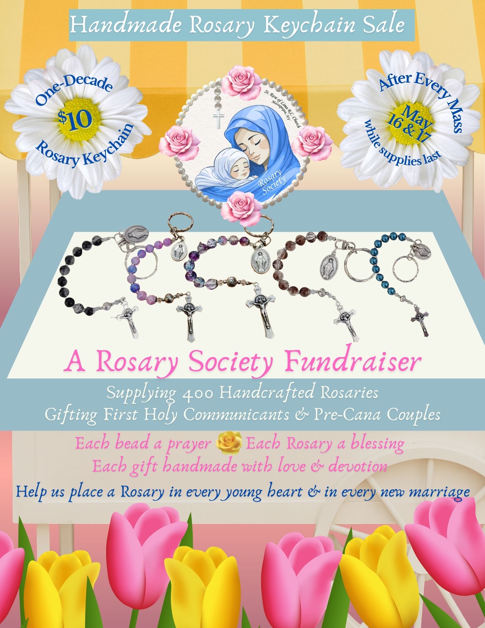 Handmade Rosary Keychain sale the weekend of May 16 & 17, after all Masses while supplies last. These handcrafted Rosaries will be gifted to every First Communicant and all Pre-Cana couples. Thank you for your support