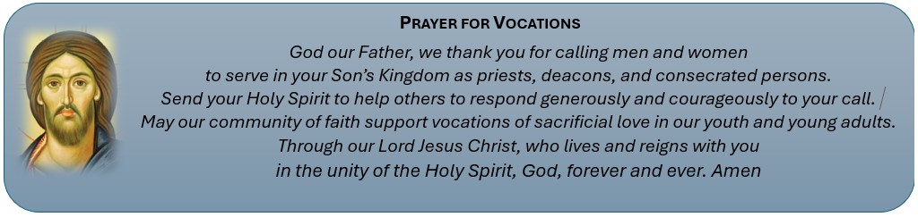PRAYING FOR VOCATIONS – Last week National Vocation Awareness Week was celebrated in our countryPlease ask Our Lord for more dedicated, holy priests, deacons, and consecrated men and women. May they be inspired by Jesus Christ, supported by our faith community, and respond generously to God’s gift of vocation.